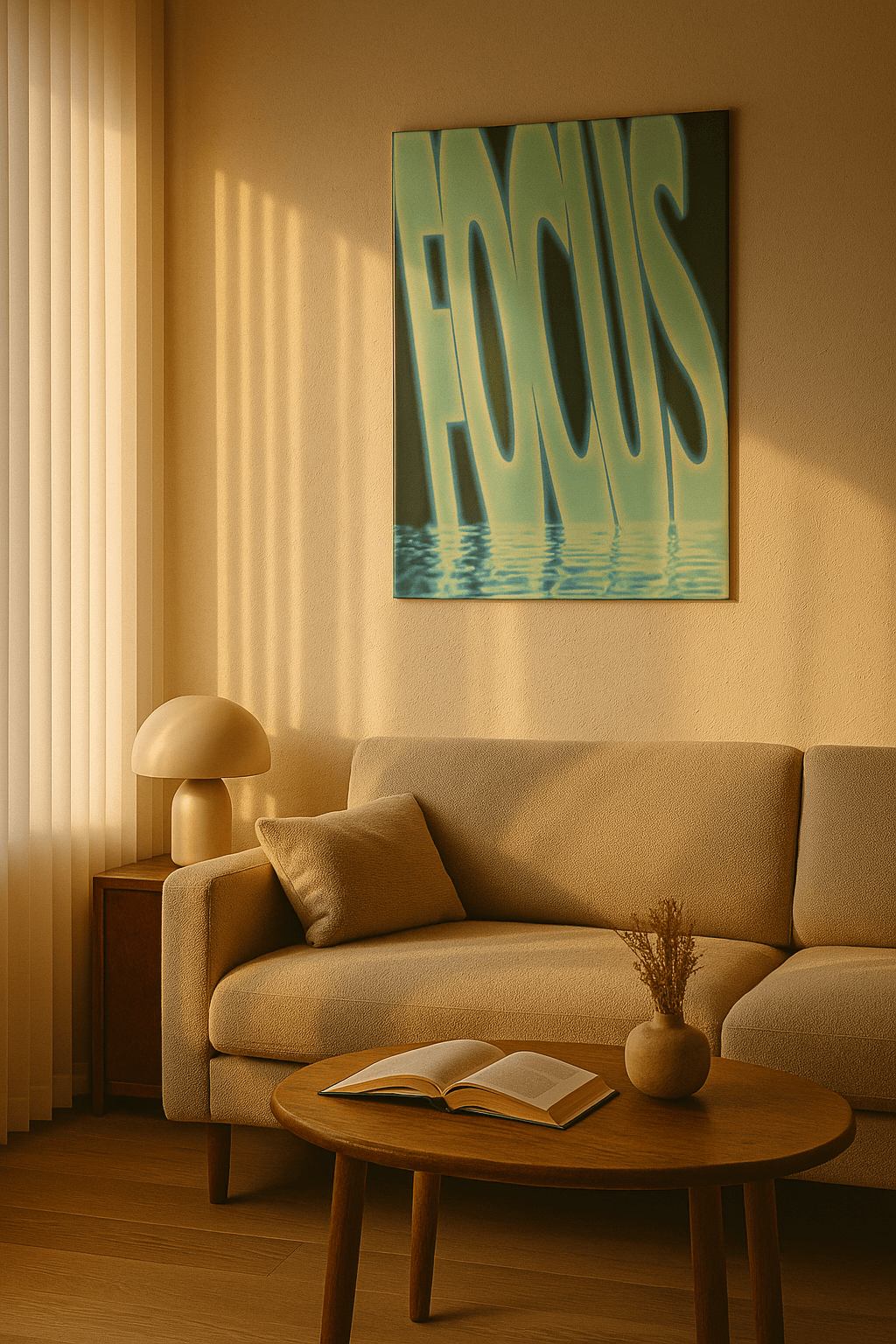 A commanding echo through blur and glow — FOCUS distorts the sharpness of typography into a radiant drift. Icy blue halos wrap around bold letters, like a memory trying to sharpen itself through the fog. It’s loud and soft all at once — a visual mantra vibrating with energy and restraint.