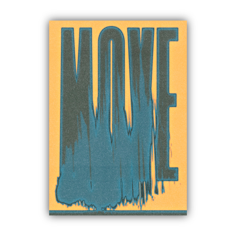 A static scream caught mid-melt — MOVE is motion interrupted, urgency pulled through syrup. Teal drips cascade from sharp type, bleeding into a golden haze like spilled ink over ambition. It’s restless, imperfect, alive — a reminder that momentum doesn’t always look clean.