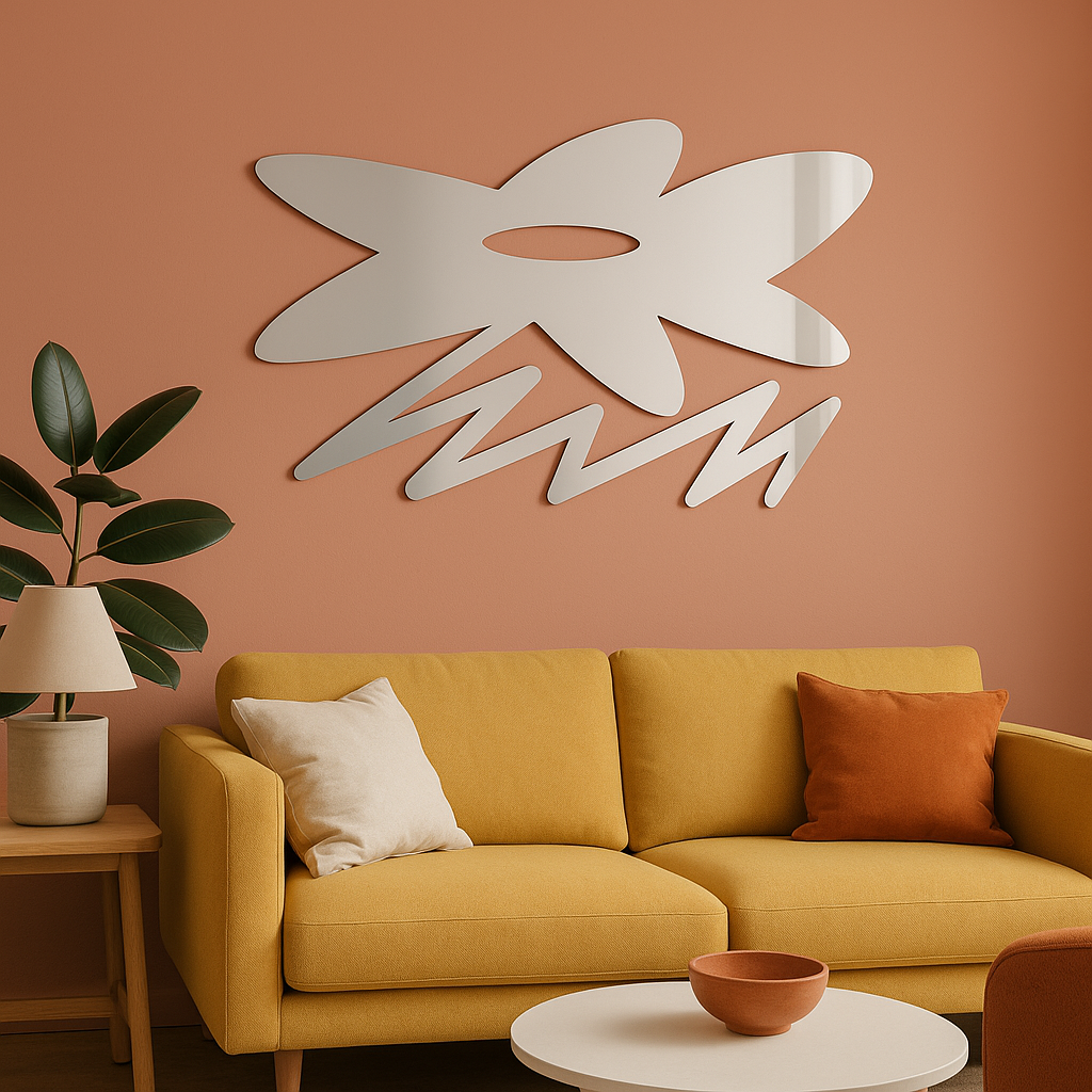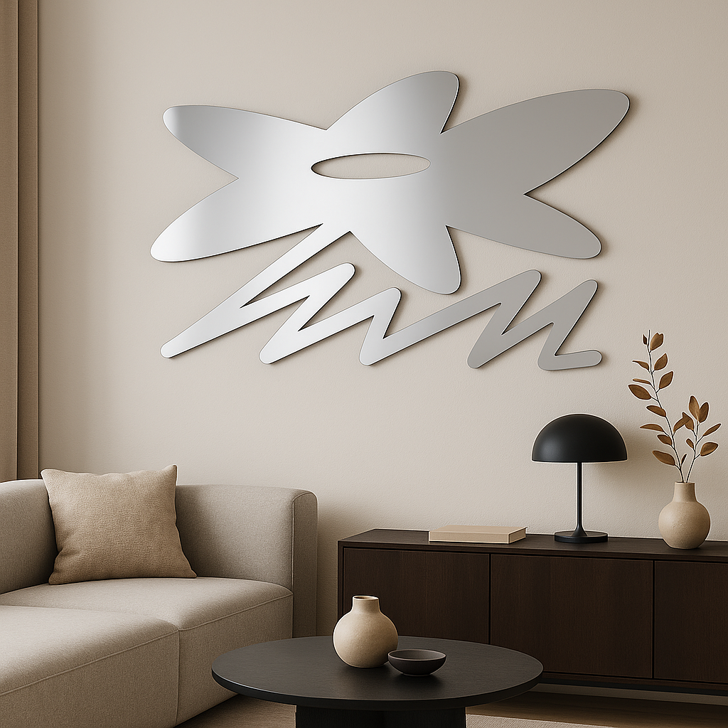 Dayflash captures that split-second spark—a burst of light, motion, and clarity in the middle of the everyday. Cut from a single sheet of high-shine acrylic mirror, this piece balances sharp zig-zag energy with the softness of an abstracted flower form.